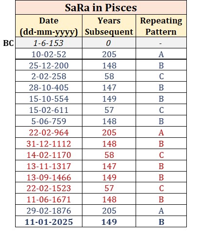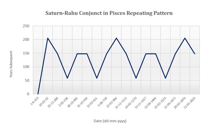 As of January 11th, 2025, Rahu is set to ingress Pisces, will be conjunct Saturn that has already been there since March 7th, 2023. Conjunction of two cruel Grahas, residing in a single sign for over a year, is an intriguing and rare celestial event that merits careful attention. Historical examinations of similar cosmic alignments reveal associations with natural disasters, wars, accidents, catastrophes, famines, and other impactful events, particularly when intertwined with the Solar Eclipses. Solar Eclipses, either with a Saturn conjunction or not, carry significant implications for both individual lives and the global landscape.